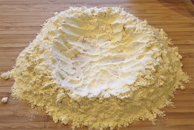 3. With a small fork, start to mix up the eggs, being careful to draw in as little flour as possible.