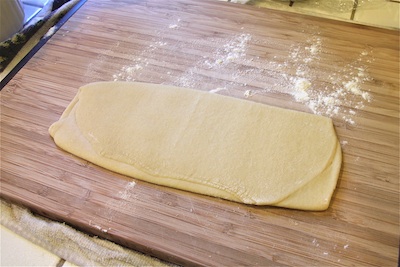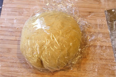 9. Separate the dough into three sections for easy working with the pasta machine. Wrap two of the sections in plastic, and move the third section to your workspace. Flatten it out by hand, and fold like a business letter. (I should note here, that if you elect to make your pasta later, you can refrigerate the dough overnight. I allow the dough to warm up on the counter for 15 minutes before beginning the process of putting it through the rollers.)